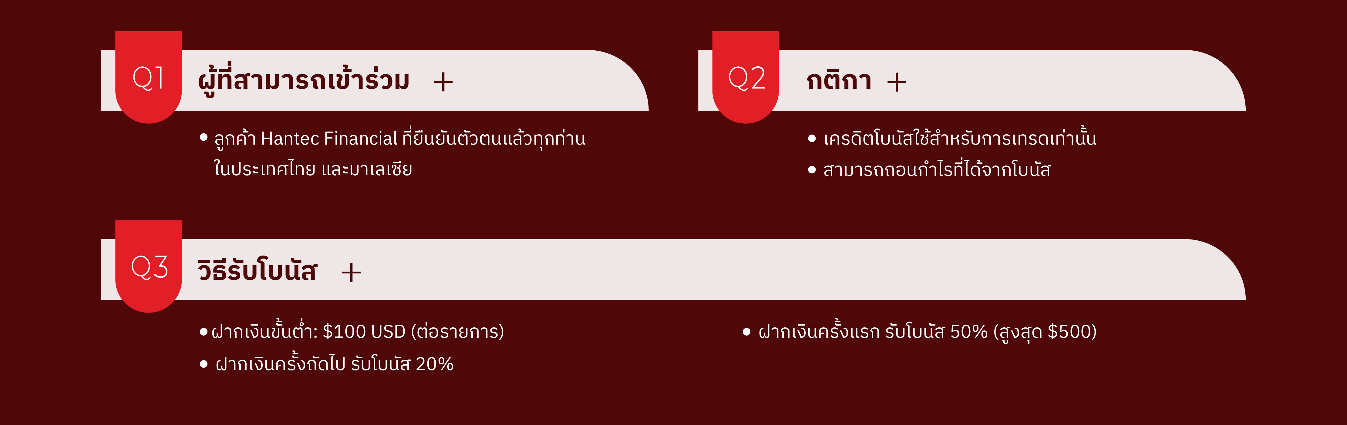 ลูกค้าที่ได้รับเครดิตโบนัสแล้ว จะไม่มีสิทธิ์เข้าร่วมโปรโมชั่นอื่นของ Hantec Financial จนกว่าโบนัสนั้นจะถูกยกเลิก